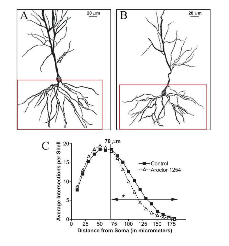 Neonatal exposure to PCBs results in reduced dendritic arbor in hippocampal CA1s of 22 do rat pups.