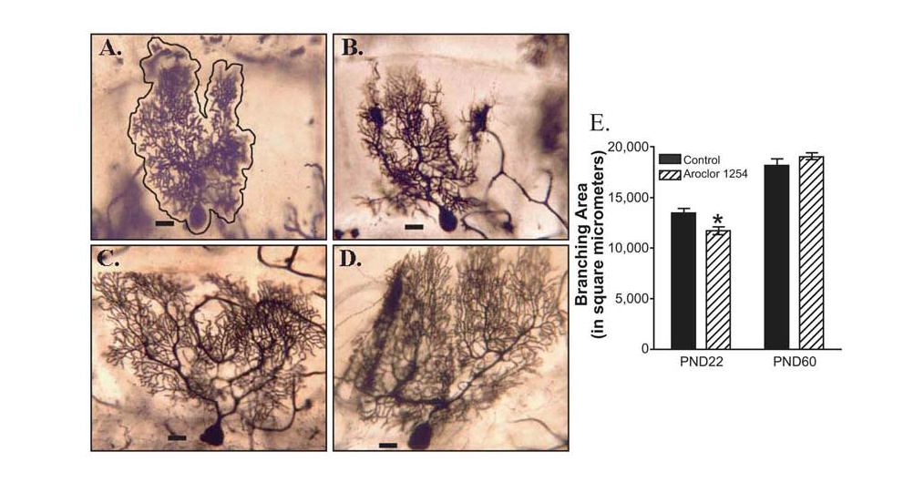 1. Measurement of area of representative Purkinje Cell dendritic arbor (22 days-old). B. Purkinje cell arbor of 22 day-old rats exposed to PCB is significantly smaller than age-matched controls. C.  Dendritic arbor of Purkinje cell from adult (60 day-old) rat cerebellum.  D. Purkinje cell dendritic arbor of 60 day old rat which had been exposed neonatally to PCBs.