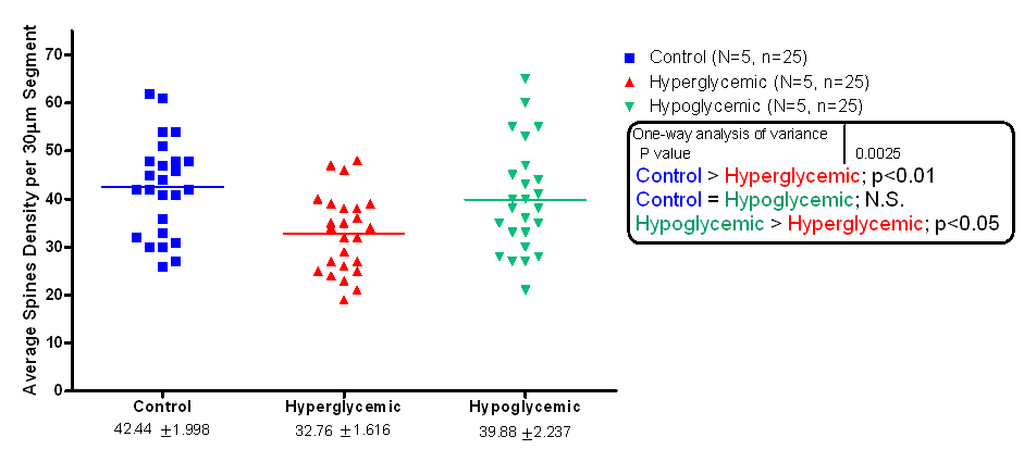 Hyperglycemic rats show significant spine loss compared to controls and hypoglycemic ra