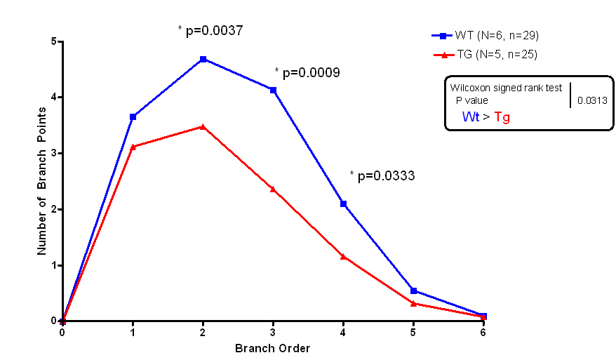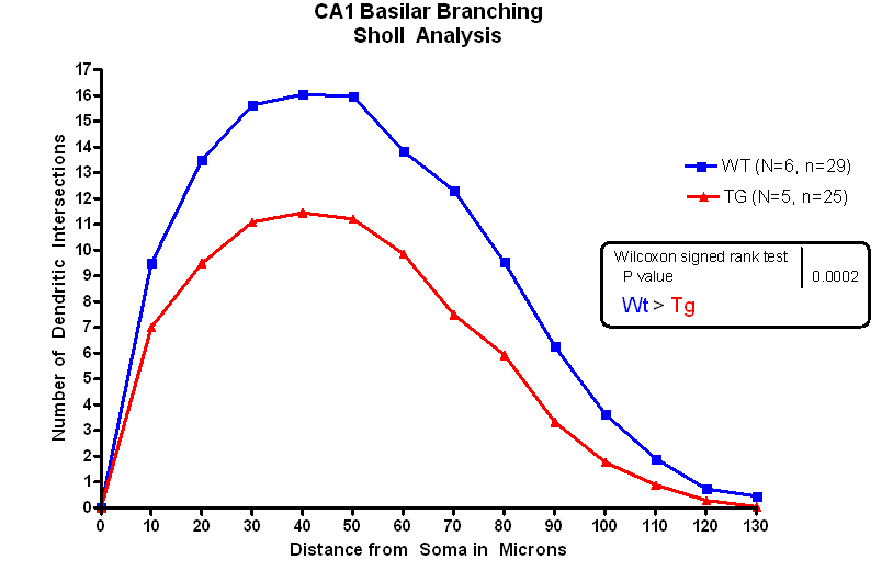The graph above compares the complexity of CA1 basilar dendritic trees from 3 month-old wild type control mice (blue) vs CA1s from an age-matched Arc A-beta mouse model of AD (red). The neurons from the AD mouse model have significantly fewer branch points than the WT controls; as such, the dendritic arbor of the AD mouse CA1s is less complex.