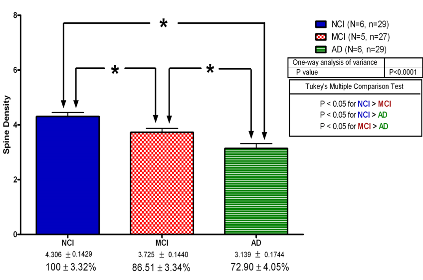 The impact of the progression of AD on dendritic spines in the temporal cortex is summarized in the accompanying graph (below)